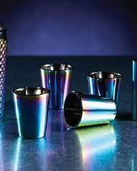 Traditional shaped shot glasses with a metallic rainbow finish. Serve and enjoy shots.